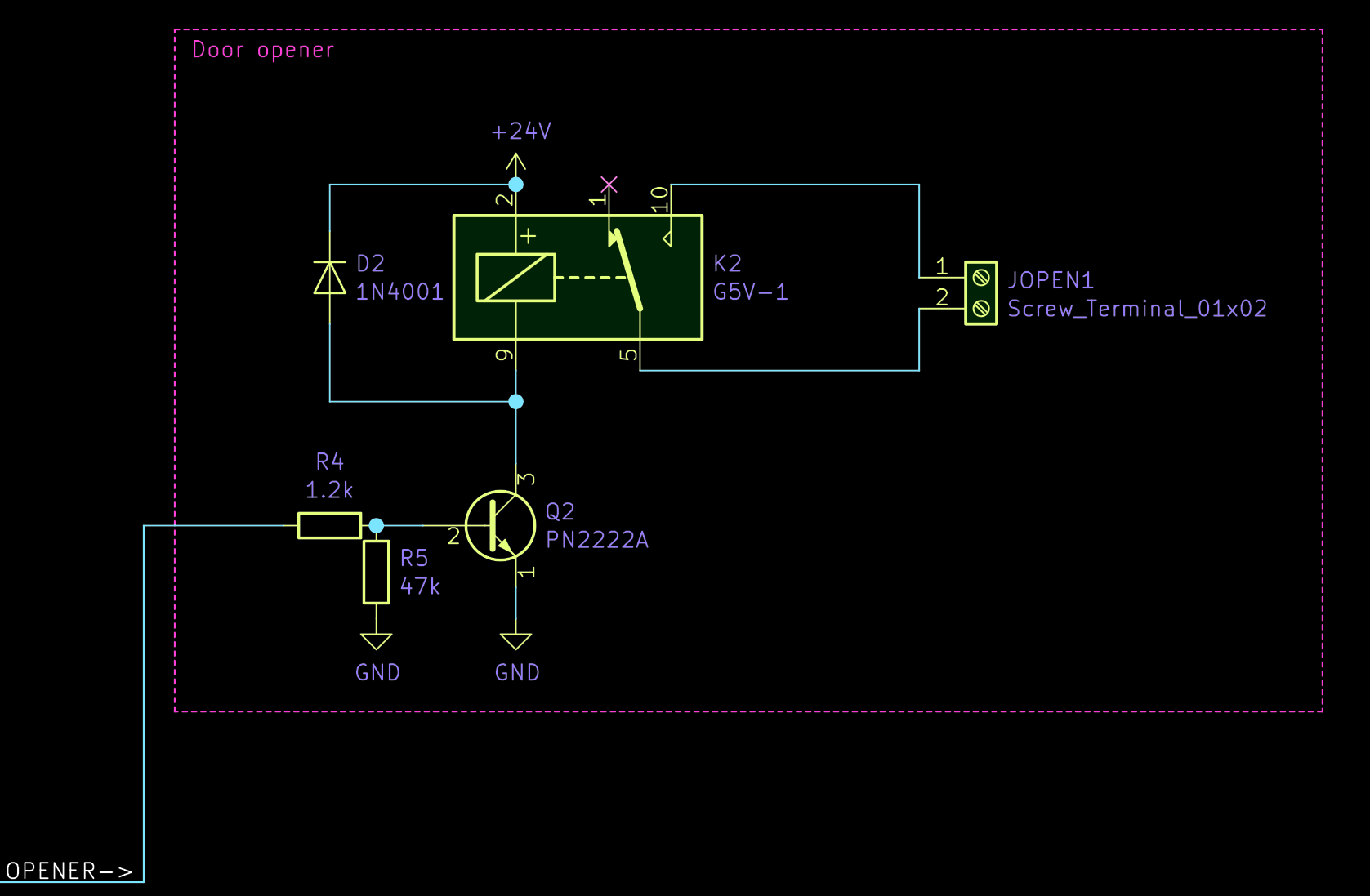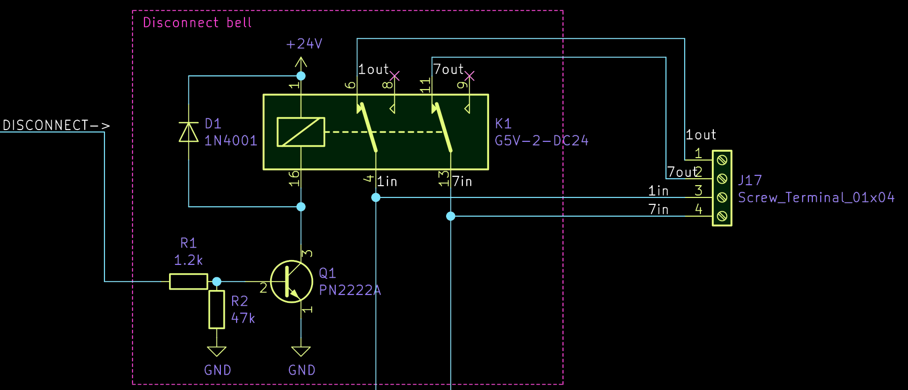 Next part of the circuit is its first feature: Disconnecting the phone from the two supply wires to disable its bell. This is a basic circuit to drive a simple relay through a transistor as you can find it anywhere on the web. Only specialty is that I am using a G5V-2-DC24 relay, which is a 24V relay6 that operates two switches at once. It would certainly suffice to disconnect only one cable from the phone, but as I was not entirely sure how the modulation works I did not want to leave the phone hanging on the other wire.