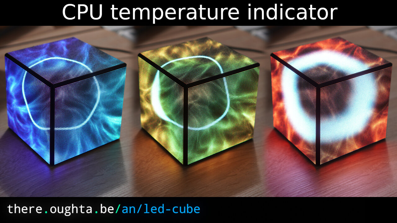 The cube automatically turns on when I start my PC and I have a simple Python script runnning in the background of the PC which reports the current temperature and usage statistics of the CPU to the cube. The colorful animation on the cube is designed to be not distracting (slow and calming) and changes such that I can see the state of the CPU at a single glance.